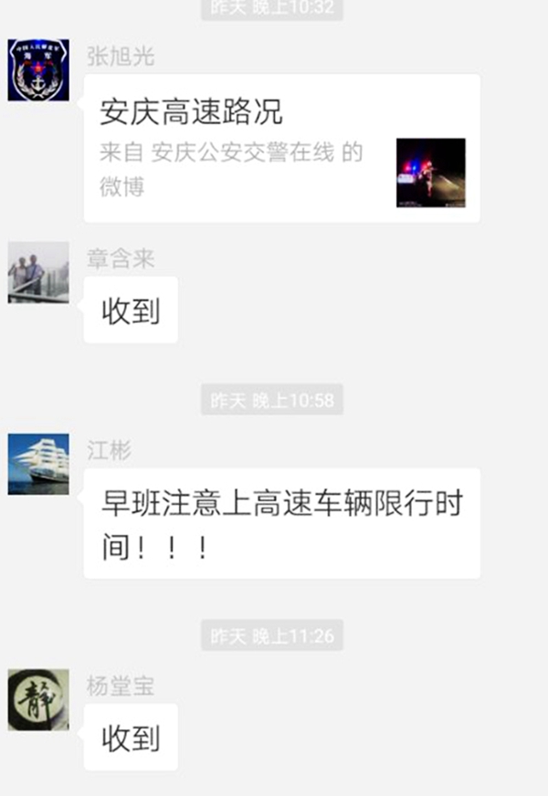 圖為11月27日大霧天氣,張旭光站長在工作群里發(fā)布實(shí)時(shí)路況