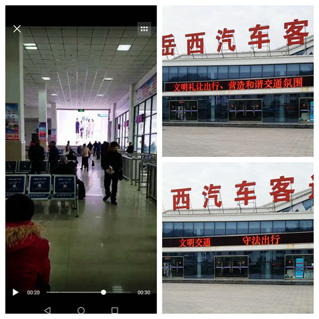 岳西分公司在交通運(yùn)輸部政府網(wǎng)站下載了《文明出行.和諧交通》、《綠色文明出行宣傳短片系列》、《文明乘車.快樂出行》等公益廣告自12月24日開始在車站候車廳電子大屏幕上滾動播放。并利用車站對外宣傳電子屏制作了《文明交通.守法出行》、《文明禮讓出行.營造和諧交通氛圍》等標(biāo)語。