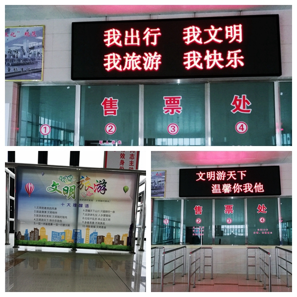 利用中心站售票廳、候車廳電子顯示屏滾動播放文明交通文明出行宣傳標(biāo)語,利于候車廳的LED屏循環(huán)播放在交通運(yùn)輸部政府網(wǎng)站交通運(yùn)輸公益廣告專題下載的《文明出行 和諧交通》、《綠色文明出行宣傳短片系列》等公益廣告。