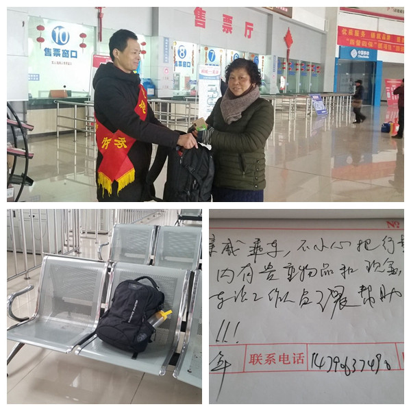 2月23日8時15分左右,桐城中心站學(xué)雷鋒志愿服務(wù)崗前一位50多歲的中年阿姨滿臉通紅,心急如焚地說:“同志,你們有沒有看到一只雙肩包,我姐姐今早做蘇州的車,上車時忘記拿了,里面還有七百多元錢!惫ぷ魅藛T王晨接待了阿姨:“阿姨別急,是黑色的雙肩包嗎?”“是的是的,你看見了嗎?”王晨說早上幫助旅客運送行李,回來從6號門經(jīng)過時,看見一只黑色的雙肩包遺失在候車室的座位上,憑工作經(jīng)驗,這肯定是旅客落下的。他立即詢問其他門號旅客,無人應(yīng)答,就將包立刻交給服務(wù)臺工作人員吳沙平,并喊來值班站長代澤燕,一起清點查找包中物品,看有沒有聯(lián)系方式。包內(nèi)有外套二件,一些零食和日用品,在夾層內(nèi)發(fā)現(xiàn)現(xiàn)金750元。查找聯(lián)系方式未果,他們心里急,但是沒辦法,只有等了。隨后就發(fā)生了開頭的一幕,在清點物品無誤后,阿姨接過失而復(fù)得的雙肩包激動地說:“同志謝謝你,我是抱著試試的心理來的,沒想到還真找到了,感謝你們!”