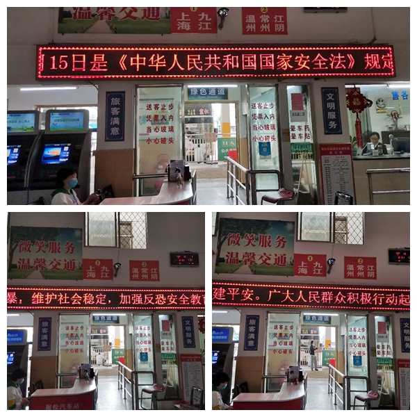 按照上級關(guān)于開展平安建設(shè)集中宣傳活動的文件要求,岳西分公司首先通過會議學習、張貼文件、在QQ群和微信群進行信息推送等多種方式對平安建設(shè)工作進行廣泛宣傳,讓文件精神傳達至每位員工和全體司售人員;其次摘取了《平安建設(shè)戶外廣告、宣傳口號》《基層與行業(yè)平安創(chuàng)建宣傳口號》《掃黑除惡專項斗爭宣傳口號》相關(guān)宣傳內(nèi)容,自5月11日以來在車站站前廣場電子屏上滾動播放。