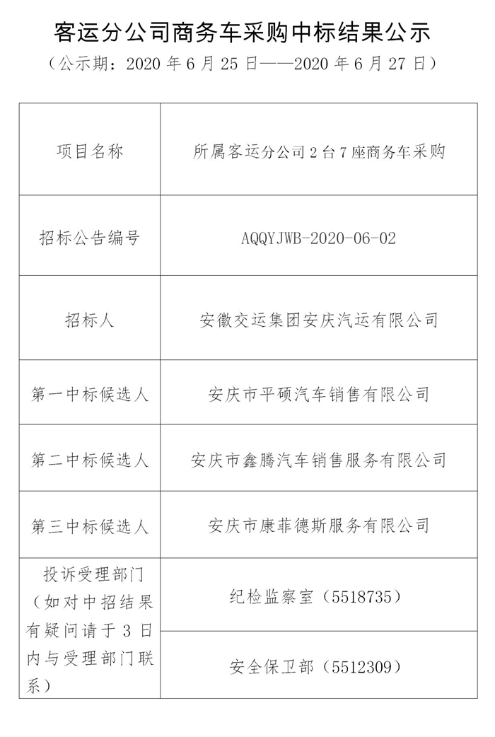 客運(yùn)分公司商務(wù)車采購中標(biāo)結(jié)果公示